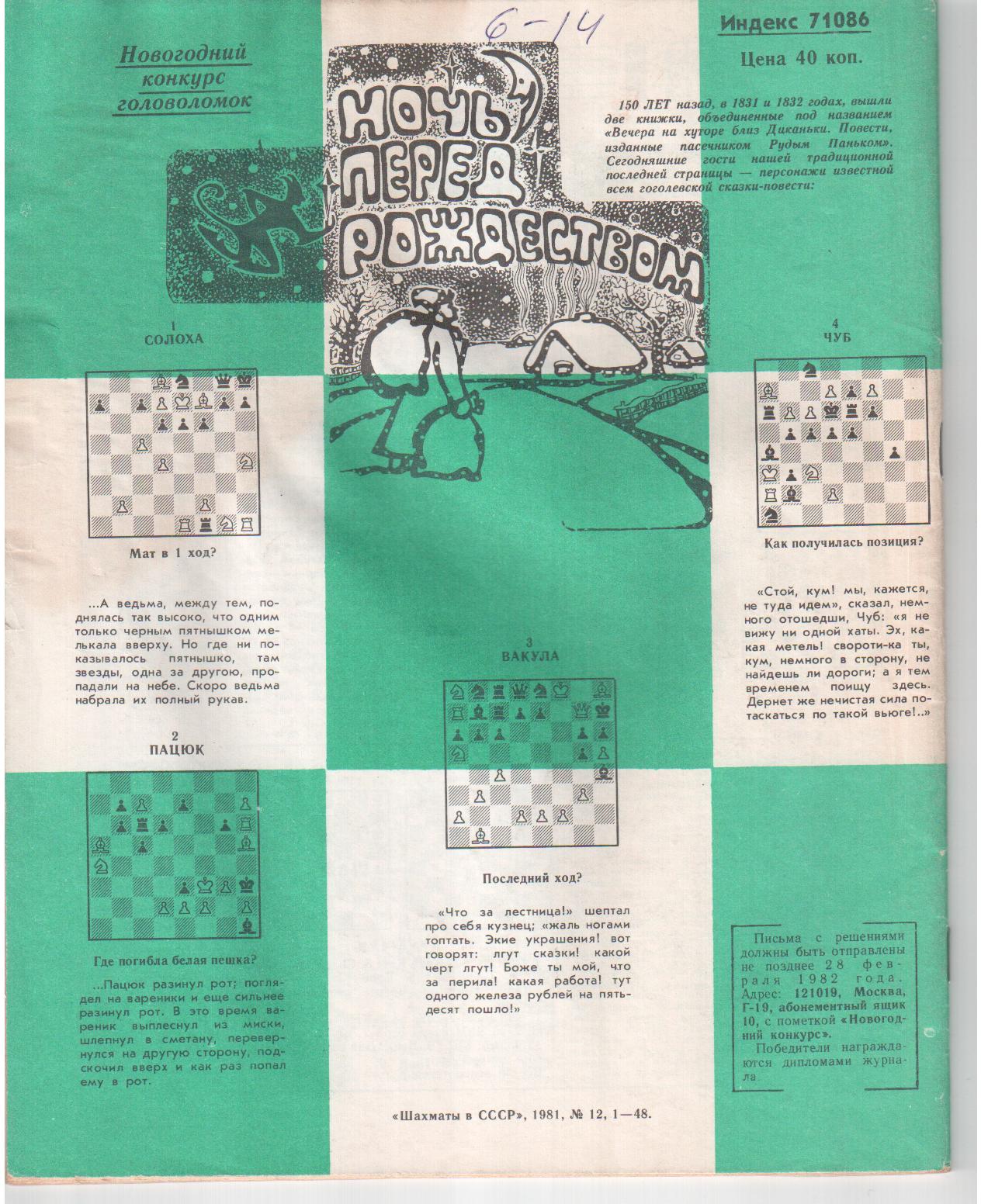 Ниже отсканированная обложка (последняя страница) журнала "Шахматы в СССР" № 12 за 1981 год с новогодним конкурсом решения задач по ретроанализу.