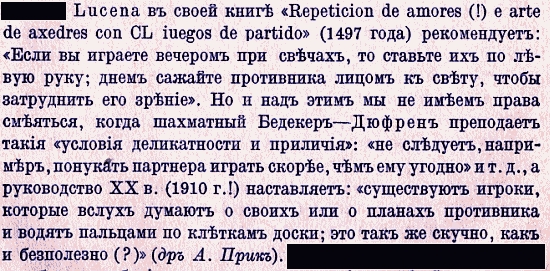 «В последнее десятилетие меркантильные интересы наложили и на шахматный мир свою тяжелую печать. Самый характер игры изменился... Небезвыгодное участие в турнирах мало по малу становится профессией, привлекающей и сильных, и слабых игроков, переезжающих с турнира на турнир...»