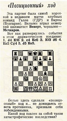 1. d4 Кf6 2. Kd2 e5 3. de Kg4 4. h3? Ке3! Белые сдались: либо мат после 5. fе Фh4+, либо теряется ферзь.
