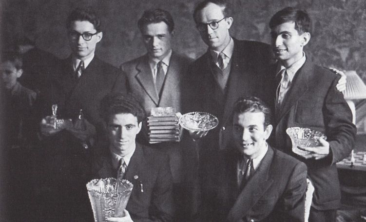 | The USSR students who won the Students Olympiad in Uppsala, April 1956: Evgeni Vasiukov (23 yrs) 5½/6 (1st res.) Lev Polugaevsky (21) 3/6 (brd 2) Anatoly Lutikov (23) 6½/7 (2nd res.) Vladimir Antoshin (26) 5½/7 (brd 4) Viktor Korchnoi (25) 6/7 (brd 1) Mikhail Tal (19) 6/7 (brd 3) |