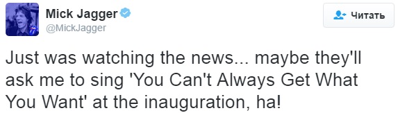 «Только что смотрел новости... Может быть они попросят меня сыграть You Can't Always Get What You Want на инаугурации, ха!» — отметил Джаггер.