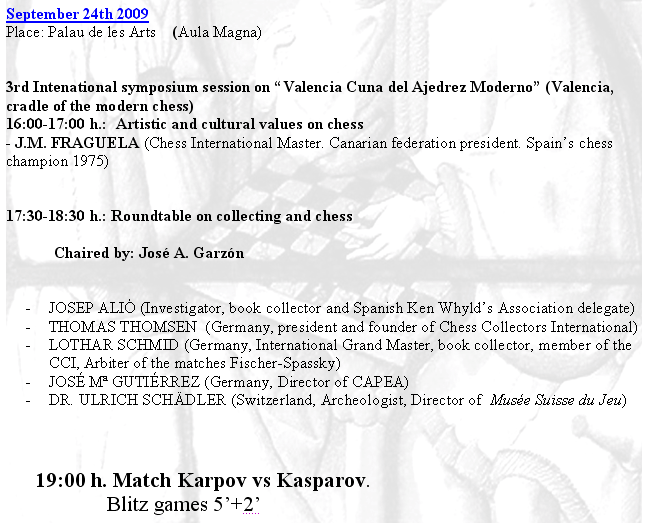 Перед началом третьей партии очень интересную лекцию о валенсийских истоках современных шахмат прочитал Юрий Авербах, который сам является шахматной легендой. Этот известный специалист в теории эндшпиля и энтузиаст шахматной истории был первым, кто предположил, еще в 1985 году, что Lucena заимствовал многие если не все шахматные задачи (может, и этюды? - Ослик), приведенные в его книге 1497 года из ныне утраченной книги валенсийца Francesch Vicent. Позже восьмидесятивосьмилетний ветеран с видимым удовольствием позировал перед фотокамерами в компании присутствующих любителей шахмат и журналистов. |