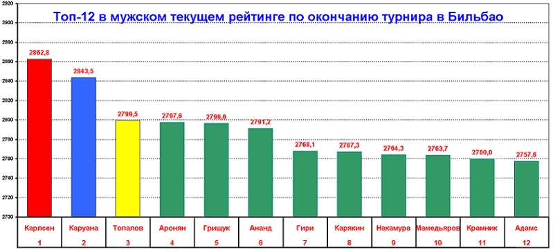 Карякин, Накамура и Крамник где-то вдали, отставая от №1 - который и сам заметно сбавил, - грубо говоря, на сотню. | Пока суд да дело, Гири обошел трех вышеупомянутых и обосновался на 7-й позиции |