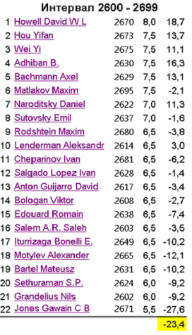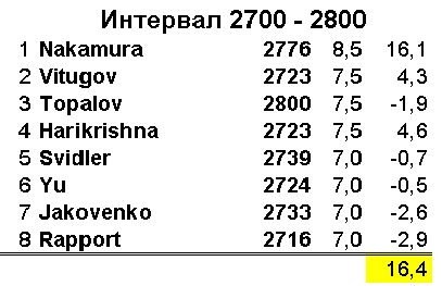 P.S. В сумме те же 16,4 (естественно). Я, правда, не знаю, правильное ли у Раппорта (в цитируемой таблице) изменение рейтинга -2,9. На 2700chess.com стоит -2,5 (отчего у меня в сумме и получилось 16,8).