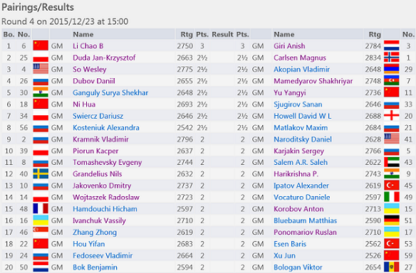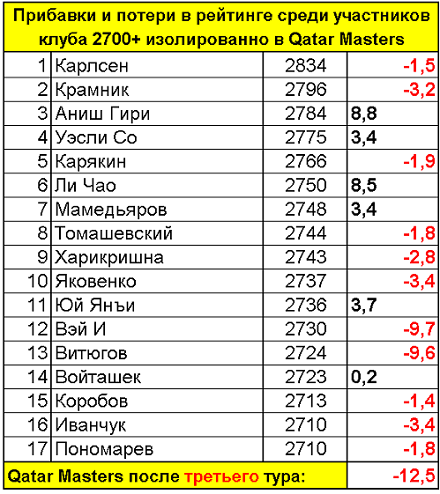dimarko: | После очередного, третьего тура Qatar Masters впереди Аниш Гири (Голландия) и Ли Чао (Китай), в активе которых по три рядовые победы. На пол-очка отстают 14 игроков, в их числе чемпион мира Магнус Карлсен (Норвегия), Уэсли Со (США), Шахрияр Мамедьяров (Азербайджан), россияне Максим Матлаков, Александр Костенюк, Санан Сюгиров и Даниил Дубов. |