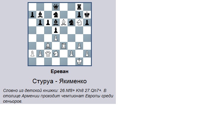 21... f5? 22. ef N:f6 23. Ref2 Ng4 24. Rf7 Qg5 25. R:d7 Rf8 26. h4 Q:d2? 27. R:g7+ Kh8 28. R:g4 (сразу выигрывает 28. Rh7+ Kg8 29. Rff7) hg (промежуточное взятие 28... R:f1+ 29. B:f1 hg спасает от немедленного мата, но, конечно, тоже безнадёжно) 29. Qe5+ Kg8 30. Q:e6+ Kh8 31. Qe5+ Kg8 32. Qxd5+ 1-0