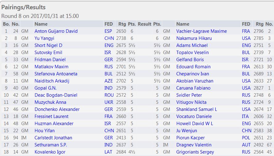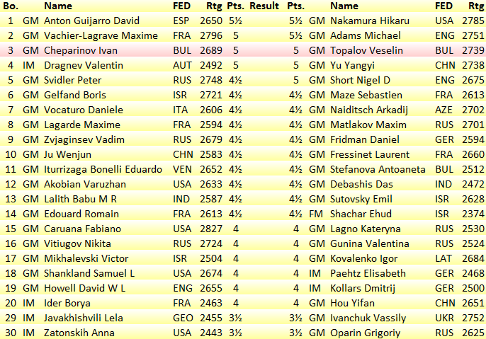 ну, а главный Максим - Вашье-Лаграв - доказал Микки Адамсу, что одно дело - белыми громить китаянок, а другое - черными отбивать натиск восьмисотника. Победив, МВЛ догнал Антона, Накаиуру и Ю Яньи. Теперь на турнире 4 лидера.