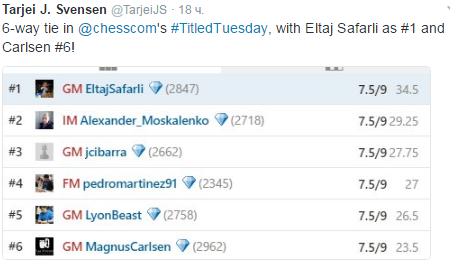 Я не слежу за этим, совсем. Знаю, что Карлсен вчера лидировал 6/6, 6.5/7, а после 9 партий получился большой дележ.