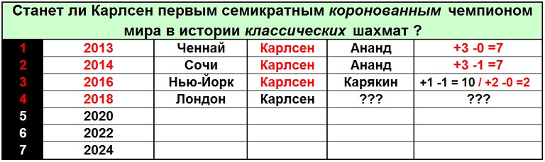 Матч в Лондоне Карлсен в любом случае завершит 27-летним. Шансы в матче у оппонентов существуют всегда, однако вне зависимости от того, кто победит в Берлине, не вызывает сомнений кто, как обычно, будет объявлен серьёзным фаворитом перед Лондоном. Это тот, кто в четвёртый раз подряд участвует в матче, кто значительно опережает как по количеству общих достижений, так и в рейтинге. Можно лишь строить догадки - каковы сакровенные планы, которые вынашиваются в ”келье/колокольне”) Магнуса. Но то, что чемпион полон достаточно амбиционных творческих планов можно не сомневаться. Кто знает, может быть амбиции Карлсена пока и осуществились-то лишь наполовину. |