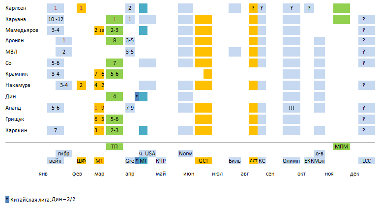 | Приличный турнир намечается в первой половине мая в Китае. В прошлом году он игрался в конце марта, состав супертурнира на 6 человек и его итоги можно посмотреть на ЧессПро. На этот раз это будет, видимо, круговик на 10 человек, Китай представят пятеро сильнейших игроков, а кто приедет из иностранцев обещают рассказать на этой неделе. (Россияне будут заняты в это время на КЧР, увы) |