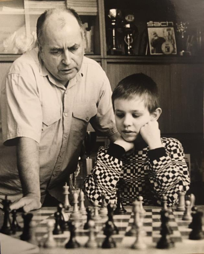 Чешский гроссмейстер Властимил Янса (р. Прага, 1942; соавтор, вместе с Властимилом Гортом, знаменитой учебной книги «Лучший ход»), на фото с молодым Давидом Наварой.