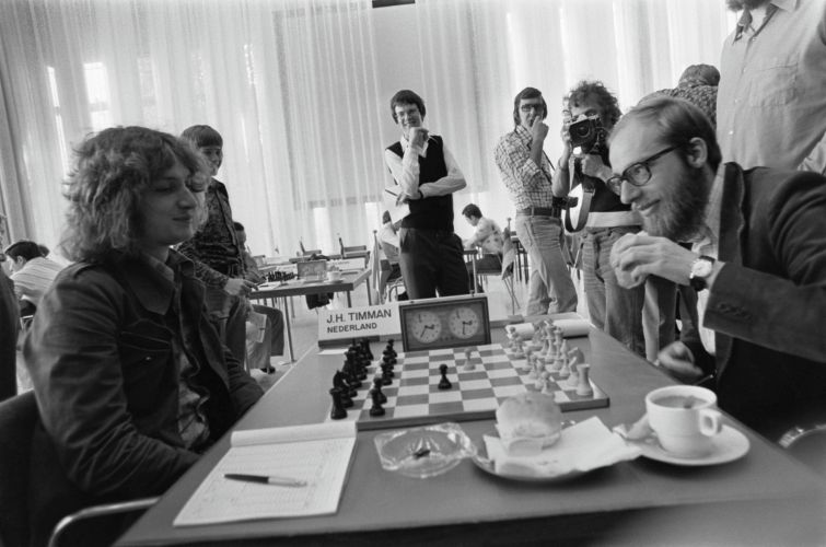 Амстердам, 19 июля 1975 года. Роберт Хюбнер (Западная Германия) встречается с Яном Тимманом (Нидерланды) в 10-м туре турнира IBM. Кажется, что-то забавляет игроков!