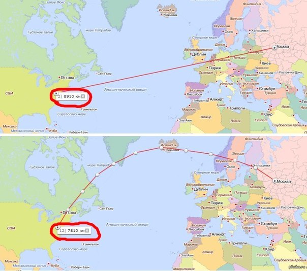 Строго говоря, ортодромия не прямая линия. На сферической Земле все прямые немножко кривые.) |
