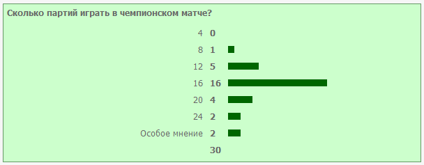 lankfrend: Я думаю что идеальный вариант 16 партий, так как гроссмейстеры сильно не устанут и кто сильнее будет достаточно ясно.