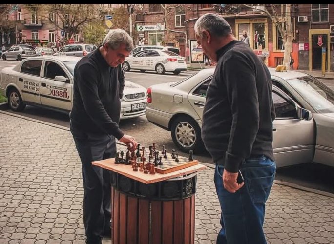 Игра в шахматы с уличным торговцем в Тбилиси. Я купил у него книгу по шахматам, и он вызвал меня на игру...