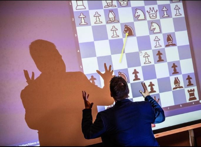Мастер и его творение!@jacobaagaard демонстрирует на экране ход, которым он гордится больше всего: 12...Nxe3!, из его партии против Перта на чемпионате Великобритании 2007 года.