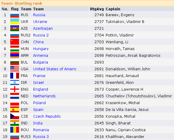 Для меня несколько непонятно, как Малахов попал в первую команду. Мне кажется, что Яковенко или те же самые Никита Витюгов с Томашевским заслуживали этого больше. Тем более участиями в приличных турнирах, например в Суперфинале, они доказывают свою состоятельность на высшем уровне. А Малахов в этот Суперфинал даже не попал. Рейтинг, конечно, штука упрямая. Но то, что средний рейтинг соперников Малахова за последний длительный интервал времени ниже его собственного пунктов на 100-150 очень сомнительно... Может на 4 доске это и хорошо, но только не в решающих играх (Азербайджан, Армения, Украина). Не нравится мне это.