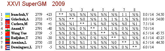 Могу добавить, что если бы заменили Вальехо на Карлсена , то это был бы первый в истории турнир 22-ой категории с шестью участниками - средний рейтинг 2775,3 ! |