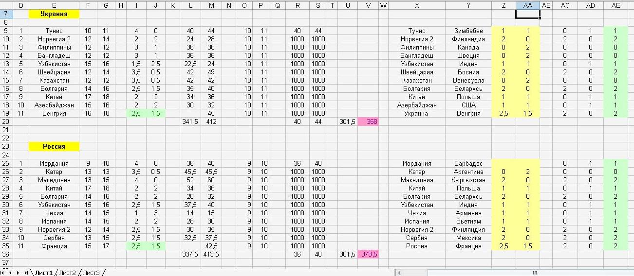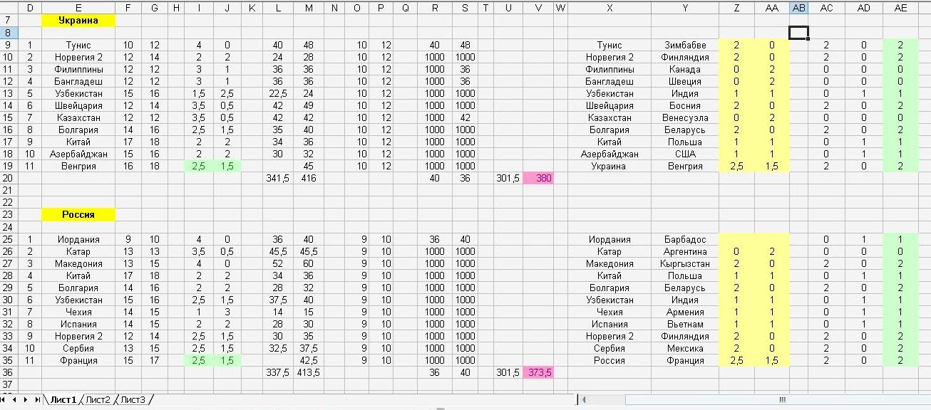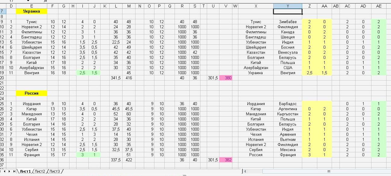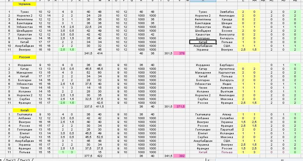 2.1 Про Китай скажу, что шансы появляются только при поражении Китая 1-3 или более. При поражении 1,5-2,5 они мизерные. Расписывать, увы, не позволяет время (как и добавить в анализ США), оставлю только табличку следующего варианта, когда Украина и Россия победили своих оппонентов со счетом 2,5-1,5, Китай проиграл 1-3, Тунис победил.