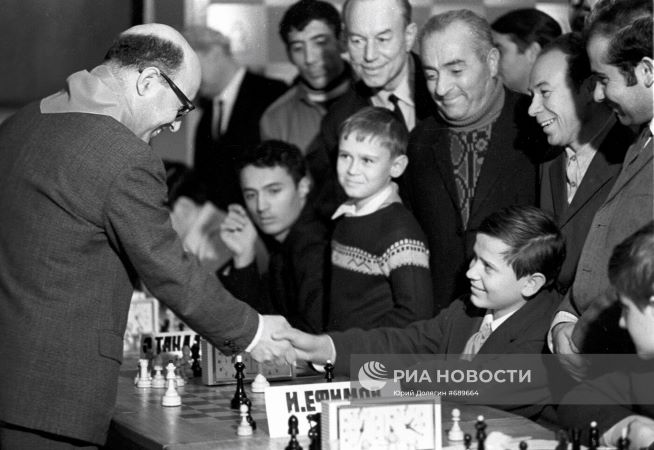 A draw can bring pleasure all around - David Bronstein (captain of the Kyiv juniors) and Igor Efimov at the 1st Pioneers Palace tournament in 1972. (Efimov became GM & moved to Italy - twice national champion too - though nowadays he is playing for Monaco). Photo from Ria Novosti