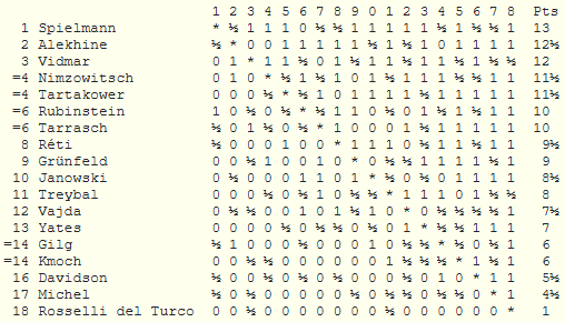 А сколько же юных будущих звезд собралось в тот год на этом замечательном курорте. Алехин, только-только вливающийся в когорту признанных игроков. Пока не блещет, но уже делит восьмое место с тоже только начинающим свой путь Тартаковером. А рядом - удивительная и загадочная личность - немецкий маэстро Леонгардт. Совсем молодой, талантливо-гениальный. Поэт, литературный критик, шахматист. Чтоб оценить масштаб его дарования - он вскоре выиграет матч у Нимцовича со счетом 4.5:0.5... И тут тоже война - Леонгардт на много лет перестанет играть в шахматы. А как было бы интересно с ним пообщаться.