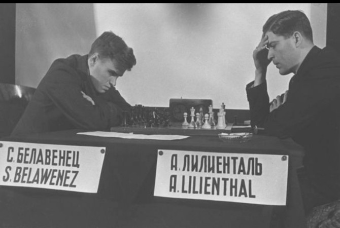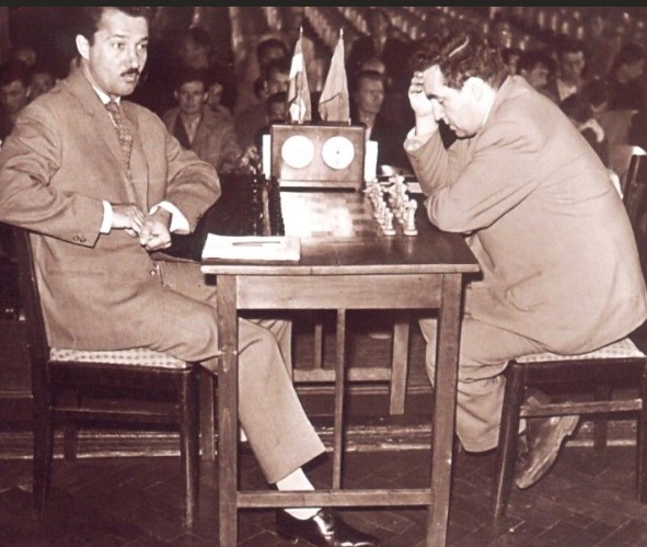 Рига, 14 января 1958 года. Давид Бронштейн встречается с Михаилом Талем во 2-м туре 25-го чемпионата СССР. Партия закончилась вничью в 30 ходов; Таль выиграл второй из своих шести(!) титулов чемпиона СССР.