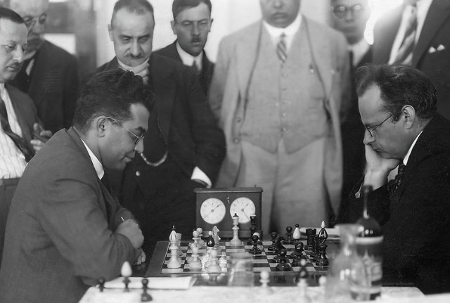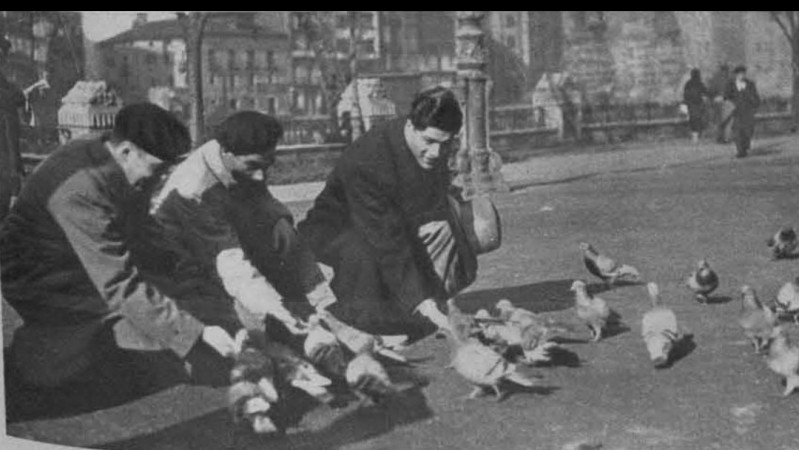 Молодой Андор Лилиенталь в фотографиях: Кормление голубей в Бильбао, ноябрь 1934; товарищеская игра с Рагозиным - смотрят Гоглидзе и Сорокин (1935); 1-я матчевая игра с Белавенцом, Москва 1935; в чемпионате СССР 1937 против Каспаряна