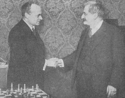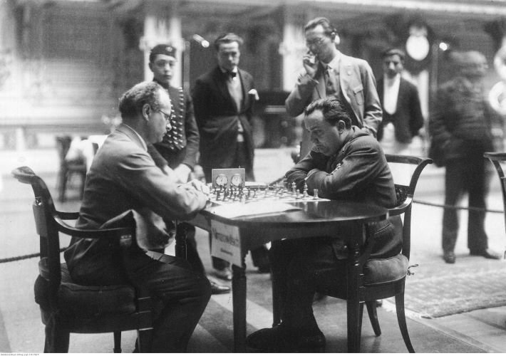 Сан-Ремо, 1930 год. Во 2-м туре (сыгранном 17 января) Арон Нимцович белыми фигурами играет с Рудольфом Шпильманом. |
