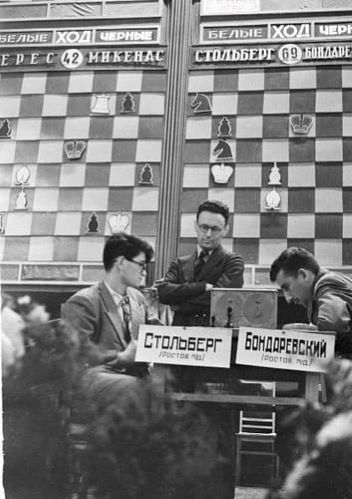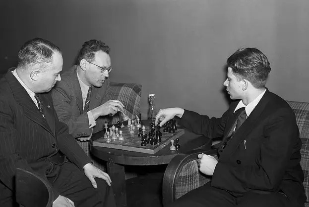 | Analysing their game from the 22nd USSR Championship – World Champion Mikhail Botvinnik and the 18-year-old Boris Spassky, as grandmaster Salo Flohr looks on. (Photo: V. Velikzhanin / TASS.) |
