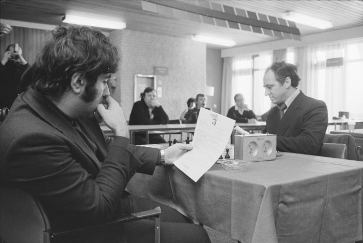 Wijk aan Zee 1979. In those days it was normal for the players to receive bulletins of the previous round's games, as here, where Israeli GM Roman Dzindzichashvili prepares to face his former Soviet colleague Lev Polugaevsky in Round 5.