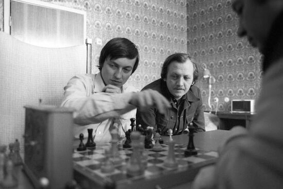 | Москва, октябрь 1981 года. Во время подготовки к предстоящему матчу на первенство мира с Виктором Корчным Анатолий Карпов играет в блиц против Игоря Зайцева, а Юрий Балашов наблюдает. |