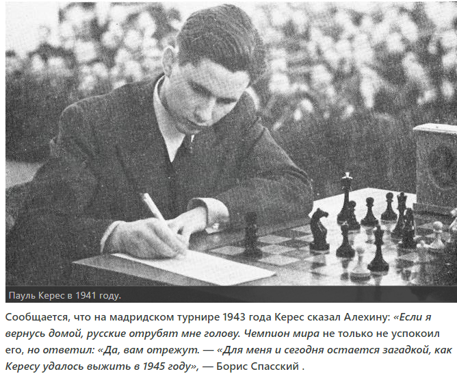И хотя на вопрос "почему Керес не стал чемпионом мира?", Спасский, фрондируя, отвечал на это еще в семидесятые годы фразой — «ему не повезло так же, как его стране», тут больше ёрничества, чем реальной оценки. Мне кажется, прежде всего, причина в том, что у Кереса не было вот этого отчаянного желания, даже необходимости быть первым. Не было. Можно выигрывать и без этого, если ты на голову выше всех, но Керес был на пике ровней самым великим, но не превосходил их. Конечно же, он не уступал, а пожалуй превосходил своего друга Эйве, который стал чемпионом. Но, скажем, Решевский не уступал Кересу — просто живя в Америке, не имел возможности посвящать себя шахматам. А Керес мог, и когда мы слышим слова о трагической судьбе эстонского гроссмейстера, это выглядит неким преувеличением. Заставили проиграть Ботвиннику в матч-турнире 1948? Спорное утверждение. Скажем так, не удивлюсь, если узнаю, что на Кереса оказывалось сильное давление (хотя никаких материалов за столько лет так и не появилось). Но Ботвинник реально был сильнее в те годы. Он получил особую бронь от советского правительства и работал над шахматами даже во время войны. Он много играл с сильнейшими советскими шахматистами, в то время как Керес за годы войны сыграл разве что два десятка партий с достойными соперниками. Ботвинник не случайно выиграл чемпионат СССР-1945 с результатом 15 из 17, а потом и Гронинген-1946. Да, Кереса в тот же Гронинген просто не пустили — последствия пристального внимания к его турнирным выступлениям во время войны. Но всё же, будем честны — Ботвинник был реально сильнейшим в те годы.