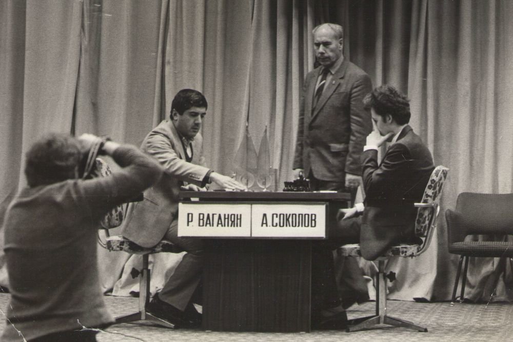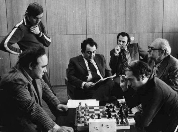 | Efim Geller vs Mikhail Tal. Anatoly Karpov, Tigran Petrosian, Alexander Roshal and Semyon Furman next to them. |