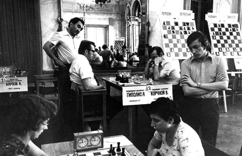 В матче Латвия - Ленинград Карпов (справа) играет против Таля на первой доске. На второй доске Корчной сталкивается с Гипслисом, а Петросян смотрит на него. |