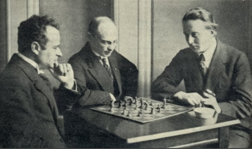 | Арон Нимцович, Савелий Тартаковер и Эгиль Якобсен. Фото: датский журнал «Мир и мы», 1923 г. |