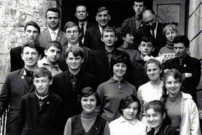 | Март 1967 года в Сочи, во время сеанса Всероссийской шахматной школы гроссмейстера Игоря Бондаревского. Слева на фото — 17-летний Евгений Свешников и 15-летний Анатолий Карпов. |