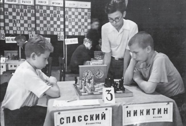 | 12-летний Борис Спасский встречается с 14-летним Александром Никитиным - Молодежный чемпионат СССР 1949 года, третья доска, Ленинград-Москва, август 1949 года (½-½ за 20 ходов). Следит за игрой Анатолий Быховский(Москва, 15 лет). |
