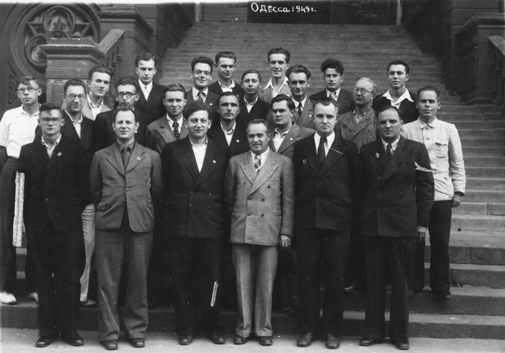 Чемпионат ДСО «Большевик», Одесса, 1949 год. В первом ряду второй справа — Василий Панов. Слева от него — Владимир Макогонов, справа — Сало Флор, Михаил Юдович и Исаак Болеславский. (Фото: gpntb.ru.) |