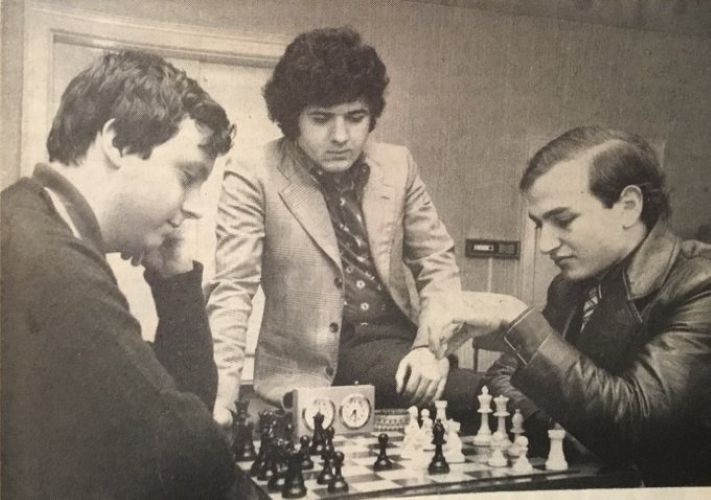 Слева направо Марк Дисен, Рафаэль Ваганян и Александр Белявский на турнире Гастингс(1974-1975)