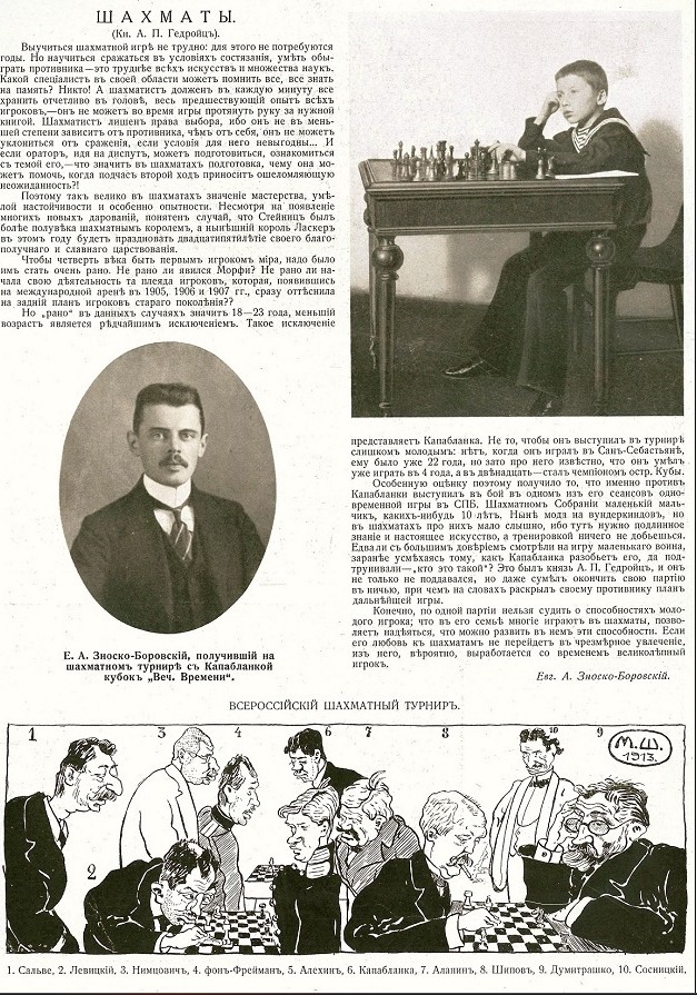 “Капабланка, — пишет автор, — вернул шахматы из области суровой науки в сферу веселого и радостного искусства”, и он описывает дальше чудесную его карьеру, победу над Ласкером, триумфы, триумфы, неожиданный период вялости и опять триумфы. Есть “игра в пространстве”, для которой характерна забота о целости и крепости каждой позиции, и “игра во времени”, т. е. игра в движении, в развитии. И вот Капабланка является игроком динамическим, “рыцарем быстро бегущего времени”. Не менее метко описывает Зноско-Боровский игру Алехина. Сравнивая его с Капабланкой, он называет последнего классиком и техником, а Алехина — романтиком и тактиком. Капабланка спокоен, и в его палитре есть гениальная гармония. Алехин горяч, воображение его не знает преград, комбинации его сказочны. “Его игра расходится словно веером, который будет сложен лишь в миг последнего удара”.