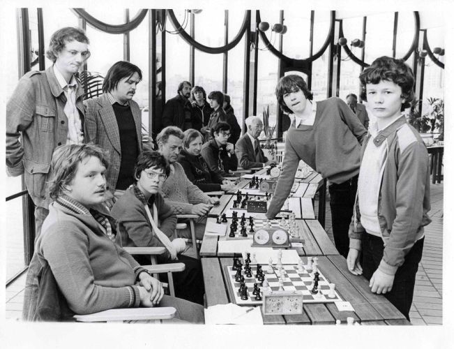 | В центре. во 2-ом ряду, высокий юноша в очках - победитель турнира Е. Владимиров. Чуть левее, в 3-ем ряду, высокий симпатичный парень с пышной шевелюрой - возможно, 2-й призёр Э. Кеньгис. |