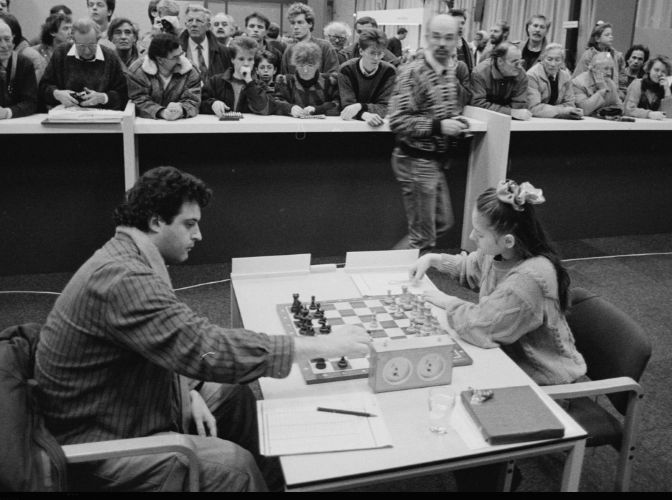Вейк-ан-Зе, 19 января 1990 года. 13-летняя Юдит Полгар (Венгрия ) встречается с Джоном Федоровичем (США ) в 4-м туре группы «B».