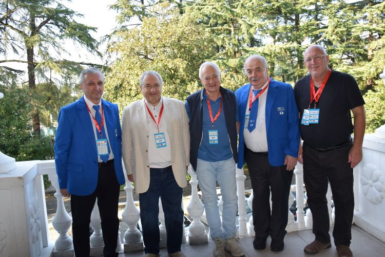 На балконе отеля" Шератон". Гиоргий Машарашвили, Геннадий Несис, Генна Сосонко ( Нидерланды).,Давид Гургенидзе и Михаил Гуревич ( Бельгия). 27 октября 2019 года. |