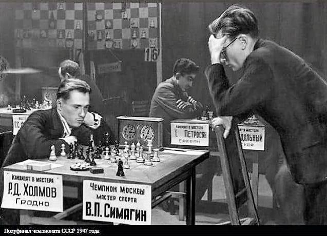 lasker emanuel: | Simagin vs. Kholmov 1947 USSR Championship Semifinals, Moscow. 1-0. Photo courtesy of Jorge Njegovic Drndak. Photographer unknown. |