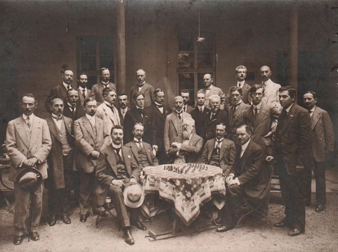 Second row: Janowski, Fahrni, Duras, Dr. Vidmar, Carls, Bogoljubow, Marshall, Hild, Robinow, Post, Dr. Tartakower, Schellenberg, Alekhine, Breyer, Réti, Sosnitsky.