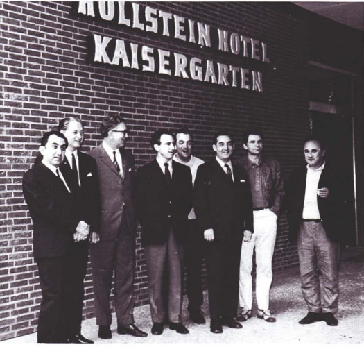 Сборная СССР (играющие и запасные участники!) перед отелем, где после Олимпиады должны были сыграть Фишер и Андерссон. 1970 год, шахматная Олимпиада. |