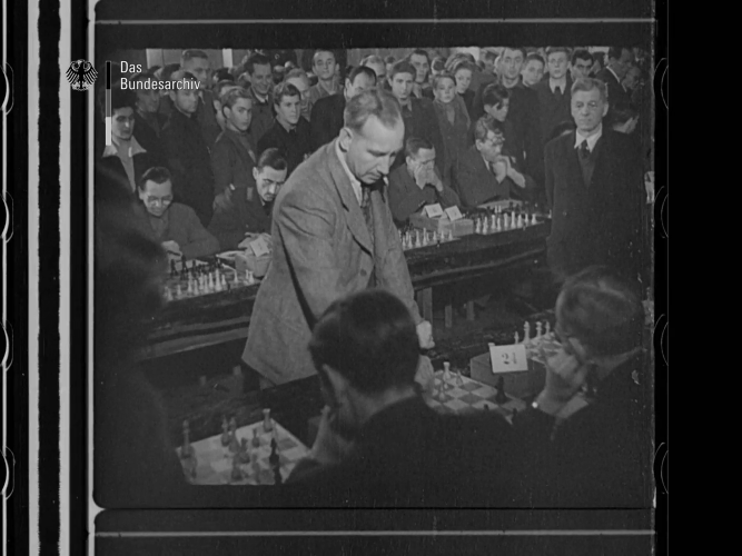 | По пути в Гаагу на матч за звание чемпиона мира по шахматам в 1948 году пятеро советских шахматистов провели сеансы одновременной игры в Берлине. Их общий результат против сильнейших берлинских шахматистов составил +69, −15, =37. С отметки 2:13 на видео можно увидеть в действии Рагозина и 26-летнего Смыслова. |