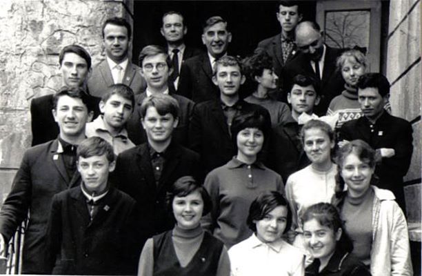 | March 1967, at a session of the chess school of Bondarevsky and Golenishchev. Sveshnikov standing right behind 'Tolja'. |