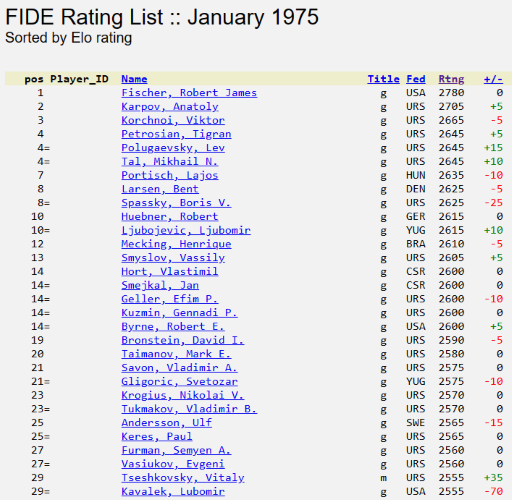 | Via olimpbase.org, the top 30 in the FIDE rating list of January 1975. (60% of them from the USSR, incidentally.) |