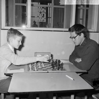 | Ханс Ри и 12-летний Ян Тимман на чемпионате Нидерландов среди юниоров, апрель 1964 года. |